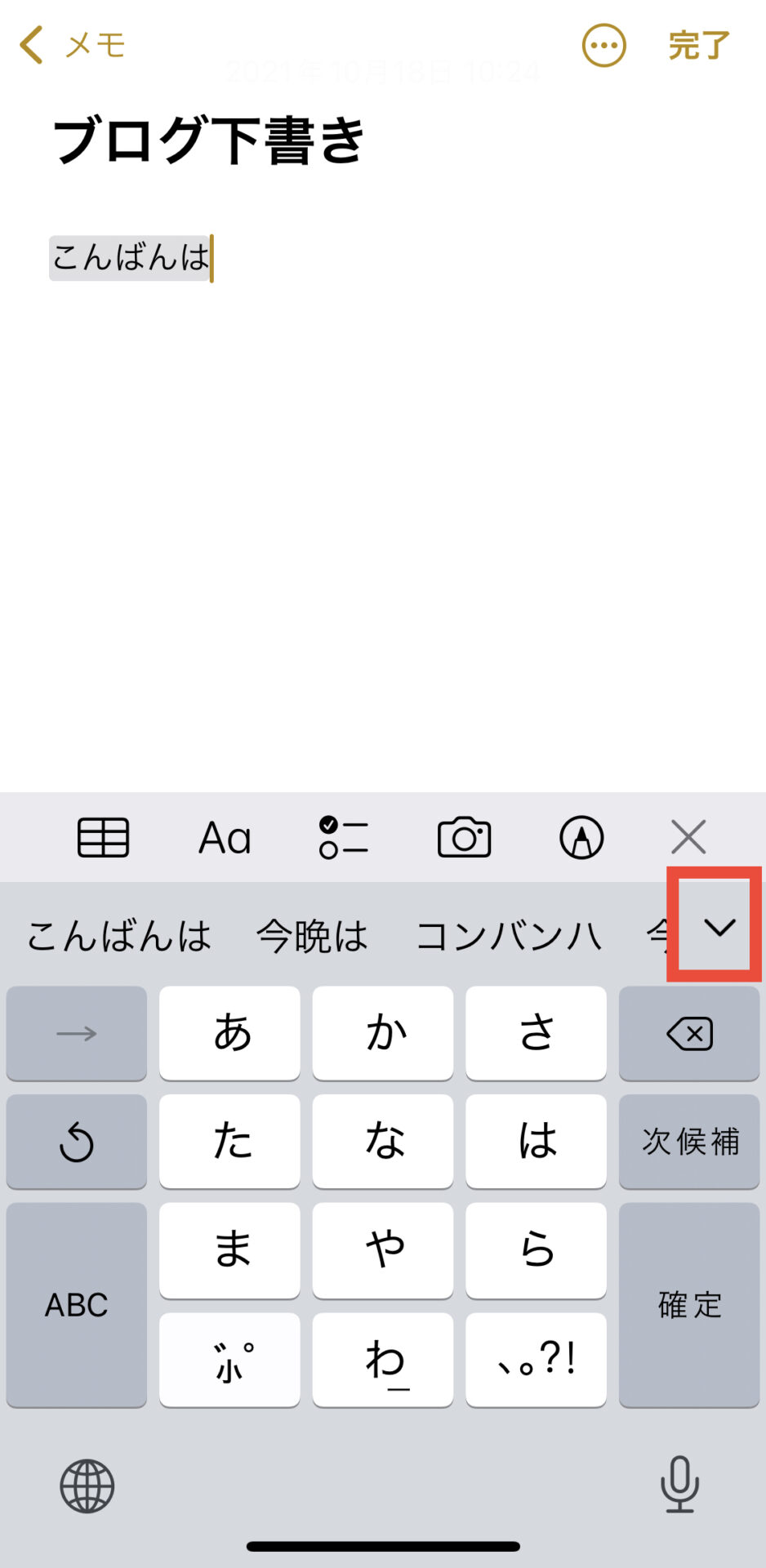 例えば『こんばんは』と文字入力をしてもらうと、このような変換候補が表示されますよね。その右側にある『v』ボタンをタップしてください。